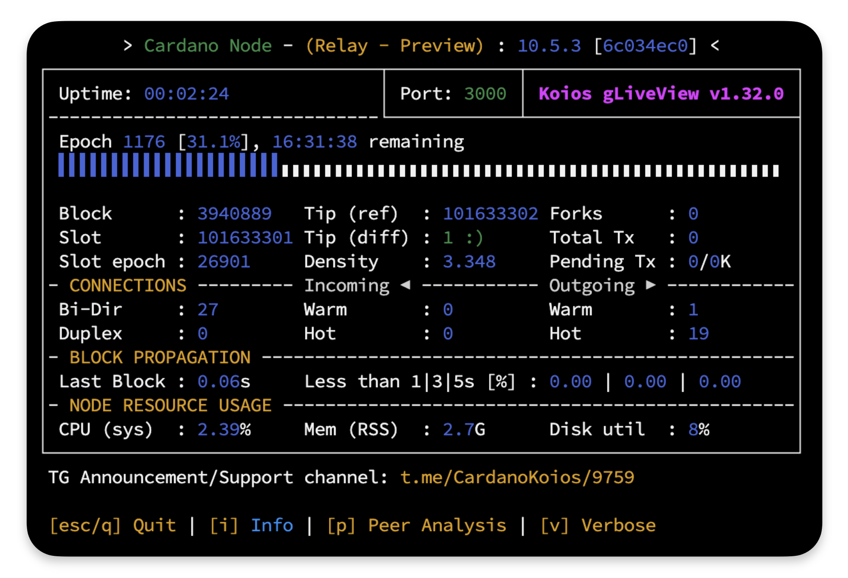 以下のコマンドを実行し、Cardano ノードの起動状態を確認します。